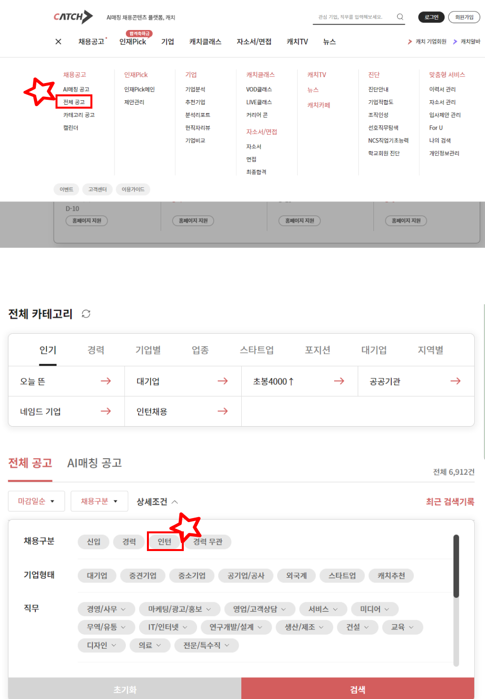 캐치에서 인턴 채용 정보만 확인하는 방법