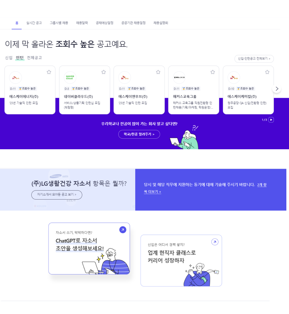 다른 채용 플랫폼보다 채용과 관련해서 인기있는 키워드들을 중심으로 우선 배치해둔 것이 눈에 띄는 것 같습니다.
