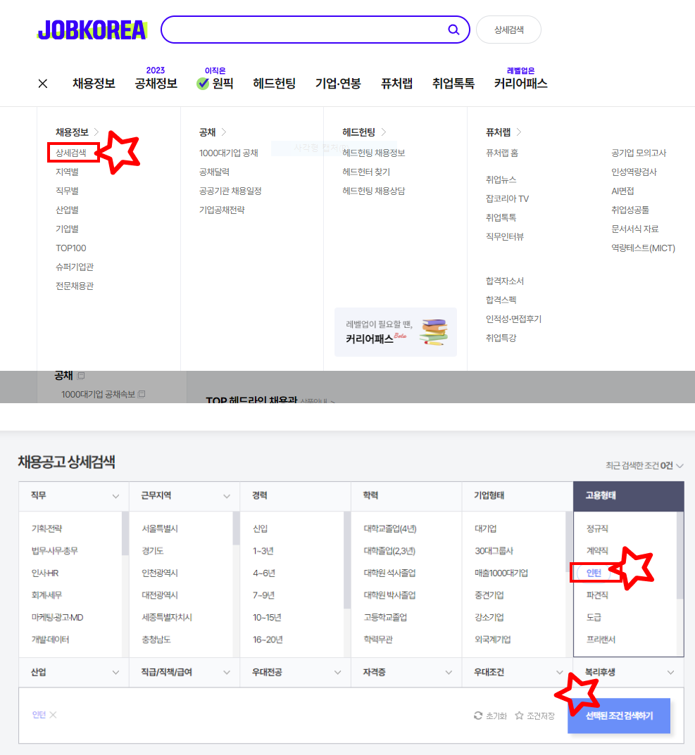 잡코리아에서 인턴 채용 정보만 확인하는 방법